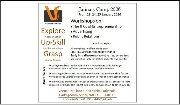 NAGPUR (Maharashtra, India): Students and young professionals looking to sharpen their creative and business skills can look forward to a short, hands-on skills training camp to be held in Nagpur on 23, 24 and 25 January, 2026. The camp will be held in offline mode only. The camp will have three workshops – The 9 Cs of Entrepreneurship, Advertising, and Public Relations. These are designed to provide practical insights and real-world exposure. Participants will get a rare opportunity to learn directly from industry professionals in an interactive classroom environment.