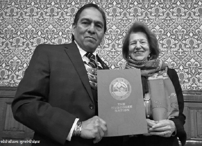 कैप्शन: मस्कोगी नेशन के प्रधान प्रमुख डेविड हिल और विंटरबोर्न की बैरोनेस निकोलसन