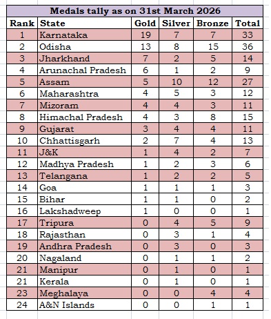Karnataka remained at the top of the table as it increased its tally to 33, which includes 19 gold, 7 silver and 7 bronze, followed closely by Odisha with 36 medals – 13 gold, 8 silver and 15 bronze. Jharkhand is at third place now with 7 gold, 2 silver and 5 bronze for a tally of 14. Arunachal Pradesh is at fourth place with 6 gold, 1 silver and 2 bronze for a tally of 9 medals. Hosts Chhattisgarh are at tenth place with 2 gold, 7 silver and 4 bronze, totaling 13 medals.