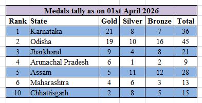 Karnataka remained at the top of the table as it increased its tally to 36, which includes 21 gold, 8 silver and 7 bronze, followed by Odisha with 45 medals – 19 gold, 10 silver and 16 bronze. Jharkhand is at third place with 9 gold, 3 silver and 7 bronze for a tally of 19. Hosts Chhattisgarh are at tenth place with 2 gold, 8 silver and 4 bronze, totaling 14 medals.