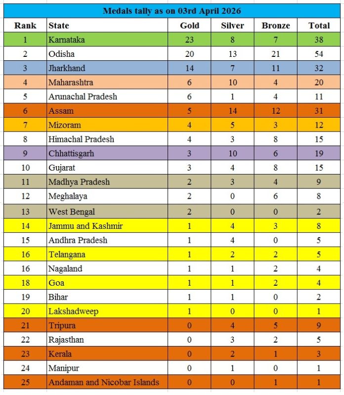 Karnataka remained on top of the medals table as it increased its tally to 38, which includes 23 gold, 8 silver and 7 bronze, followed by Odisha with 54 medals – 20 gold, 13 silver and 21 bronze. Jharkhand finished at third place with 14 gold, 7 silver and 11 bronze for a tally of 32. Hosts Chhattisgarh finished at ninth place with 3 gold, 10 silver and 6 bronze, totaling 19 medals.